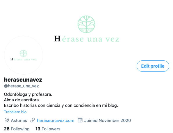 Soy @herase_una_vez en Twitter desde noviembre de este año, cuando comencé el curso mencionado de la UPNA, abrí esta web y las redes sociales asociadas para su posible difusión. Mi apatía por esta red se refleja en todo mi perfil: desde la escasez de interacciones y seguimientos (casi todos ellos compañeros del curso), hasta lo vago de mis 35 publicaciones que no son más que contenidos automáticos generados por este blog. Añadiremos la pereza a la Lista de cosas por cambiar y buenos propósitos para el 2021.