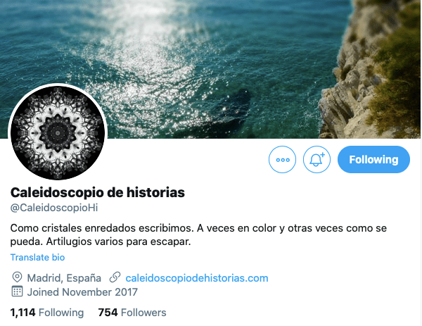 @caleidoscopiohi: «Como cristales enredados escribimos. A veces en color y otras veces como se pueda. Artilugios varios para escapar«. Tiene su web de relatos, poesía, frases y citas. No se sabe quién es ni a qué se dedica, pero compartimos gusto por la escritura.