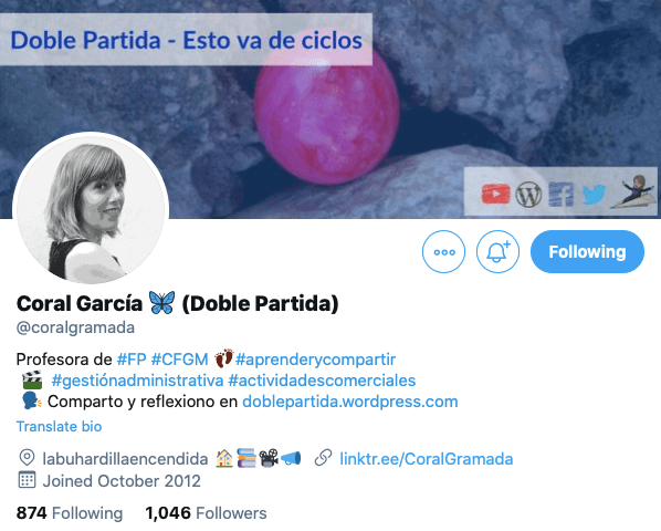 @coralgramada: Otro de los perfiles más parecido al mío, a pesar de no ser odontóloga. Es profesora de FP y comparte en su web sobre flipped classroom y gamificación (temática de mi TFM en el Máster de Profesorado).Metodologías de enseñanza afines y gusto por la divulgación. Puede ser un referente cuando continue con mi Máster de e-learning.