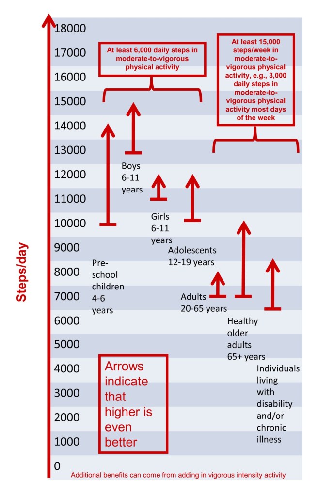 Tudor-Locke C, Craig CL, Brown WJ, Clemes SA, De Cocker K, Giles-Corti B, Hatano Y, Inoue S, Matsudo SM, Mutrie N, Oppert JM, Rowe DA, Schmidt MD, Schofield GM, Spence JC, Teixeira PJ, Tully MA, Blair SN. How many steps/day are enough? For adults. Int J Behav Nutr Phys Act. 2011 Jul 28;8:79. doi: 10.1186/1479-5868-8-79. PMID: 21798015; PMCID: PMC3197470.