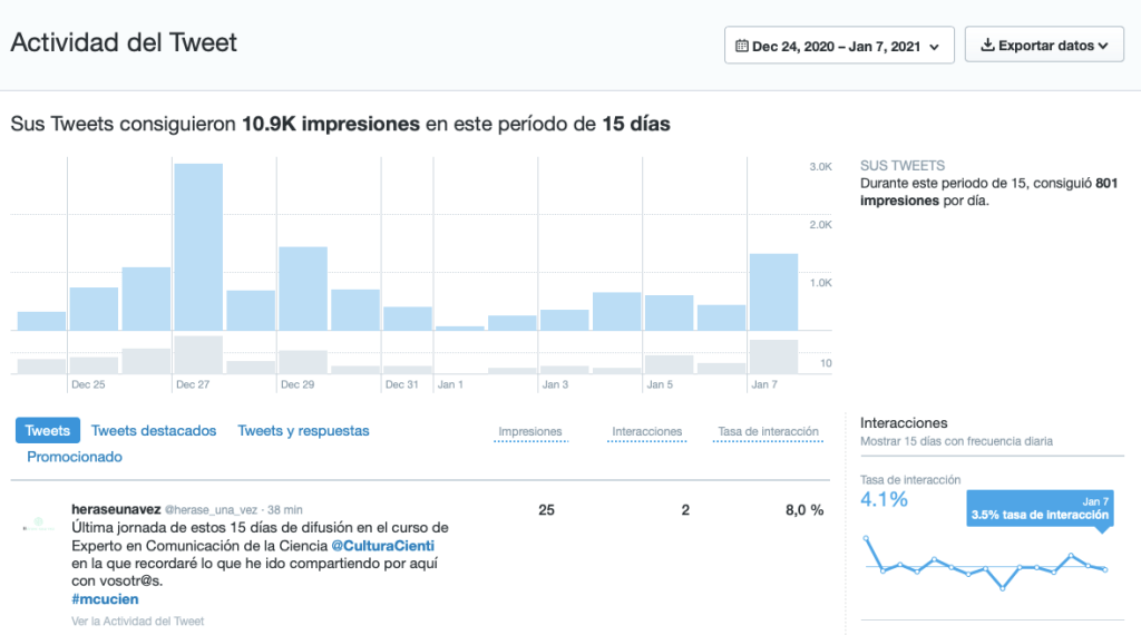 Hace un par de semanas hice una presentación y análisis de mi Twitter y la actividad que había tenido por allí hasta la fecha y establecí unos objetivos para una mini-campaña de difusión que he realizado como parte del curso de Experto en Comunicación de la Ciencia de la UPNA.