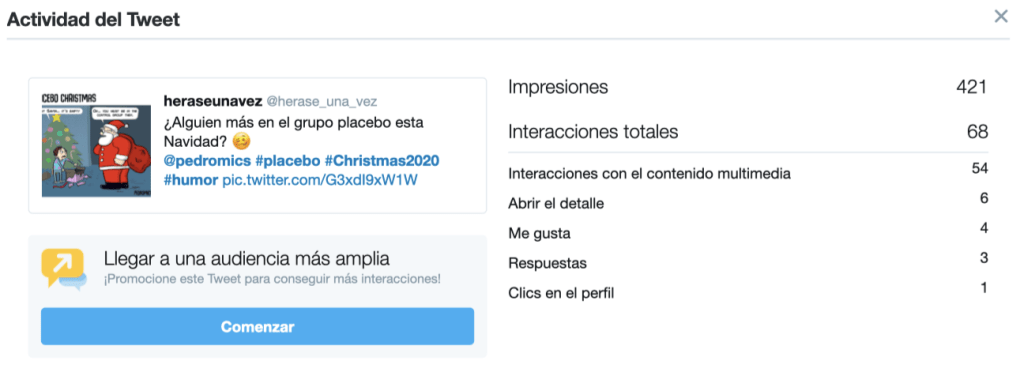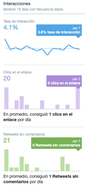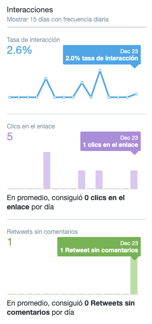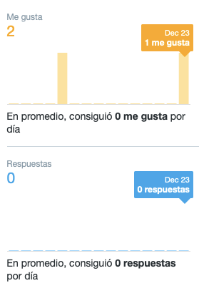 He aumentado mis clics en enlaces (de 5 a 20), los retweets sin comentarios (de 1 a 21), los «Me gusta» (de 2 a 108) y las respuestas (de 0 a 89).
