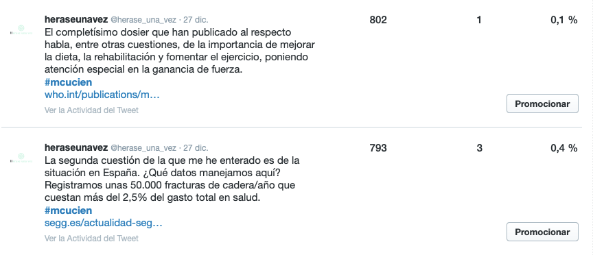 El 27 de diciembre fue el día más activo en Twitter, con el hilo dedicado a la osteoporosis, la menopausia y el envejecimiento activo, que es uno de los que mayor alcance ha tenido. El menos activo fue el día 1 de enero que me tomé la jornada de descanso.